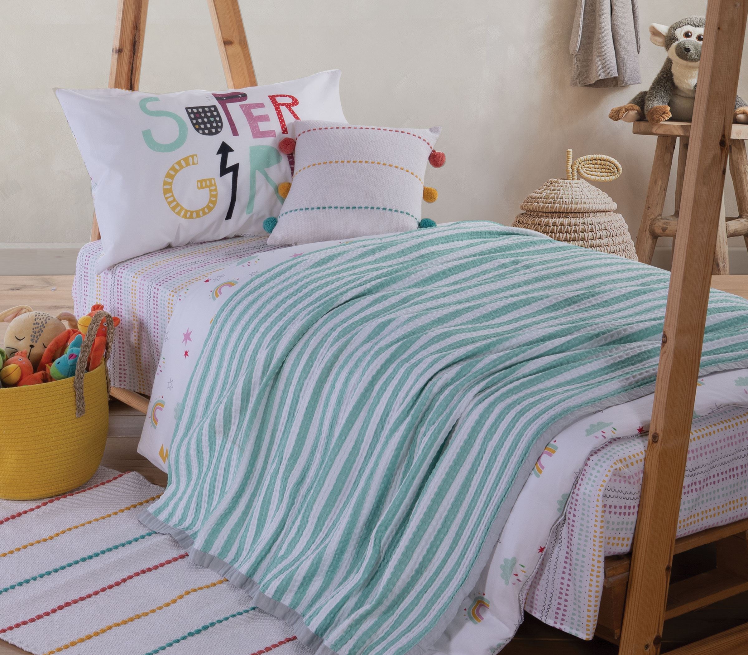 Ένα καινούργιο κουβερλί, μια πικέ κουβέρτα, δύο μαλακά μαξιλάρια με υπέροχα σχέδια και prints, και σεντόνια με ενυπωσιακά τυπώματα αρκούν για να αποπνέει μια αύρα ανανέωσης το παιδικό δωμάτιο και να δημιουργηθεί μια παιχνιδιάρικη ατμόσφαιρα που εγγυάται όνειρα παραμυθένια!