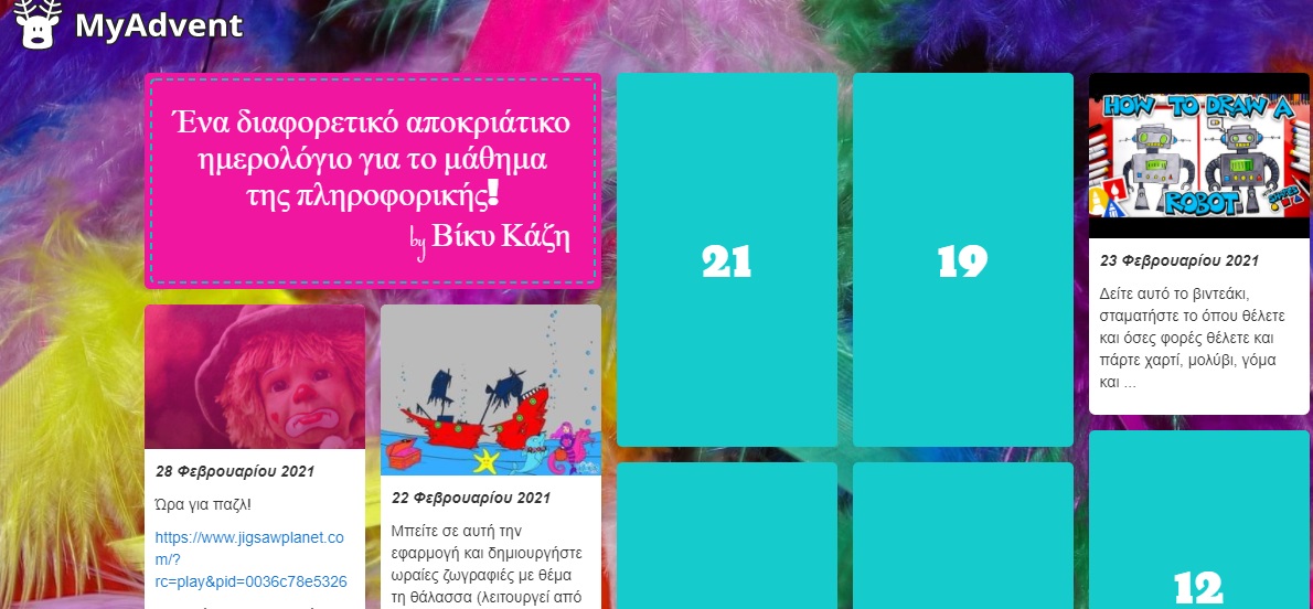 To ημερολόγιο ξεκινά στις 21 Φεβρουαρίου με την έναρξη του Τριωδίου και ολοκληρώνεται την Καθαρά Δευτέρα στις 15 Μαρτίου.  Πατώντας εδώ θα βρείτε αυτό το ψηφιακό αποκριάτικο ημερολόγιο και πατώντας πάνω στους αριθμούς θα βρείτε ξεχωριστές  εκπλήξεις και προτάσεις ψυχαγωγίας που συνδυάζουν τη χαρά της Αποκριάς με το μάθημα της Πληροφορικής.