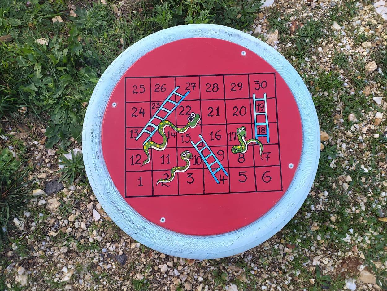 Πέρα από τα δημοφιλή παιχνίδια φιδάκι και κουτσό που είναι ζωγραφισμένα με όμορφα φωτεινά χρώματα στο δάπεδο του προαυλίου, υπάρχουν διάσπαρτα παιχνίδια σε παλιά ελαστικά που έχουν βαφτεί και δίνουν μια άλλη νότα στην αυλή του σχολείου.