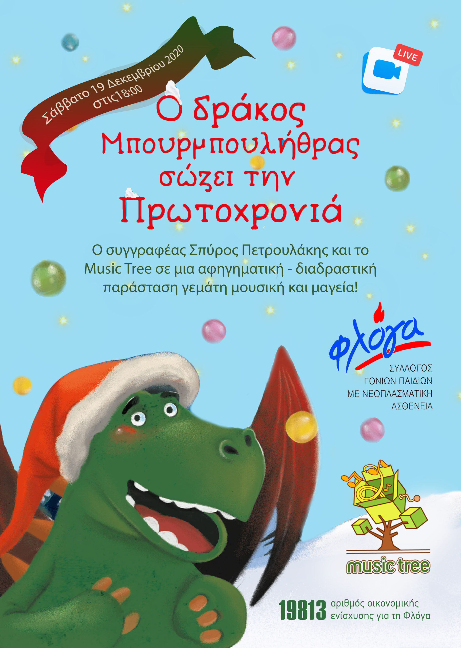 Ο συγγραφέας Σπύρος Πετρουλάκης και το Music Tree μας προσκαλούν να παρακολουθήσουμε online την αφηγηματική – διαδραστική παράσταση “Ο Δράκος Μπουρμπουλήθρας σώζει την Πρωτοχρονιά” που είναι αφιερωμένη στη ΦΛΟΓΑ, το Σάββατο 19 Δεκεμβρίου στις 18:00.