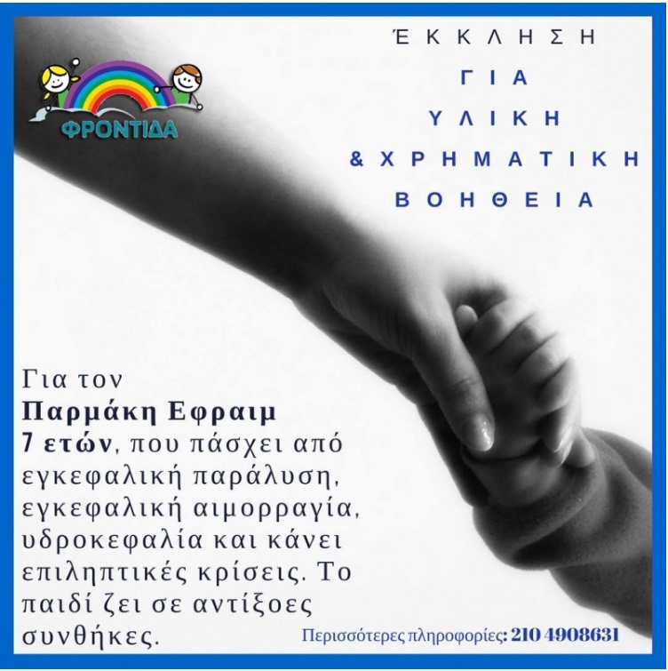 Ο Πανελλήνιος Σύλλογος για Άτομα με Εγκεφαλική Παράλυση “ΦΡΟΝΤΙΔΑ” απευθύνει έκκληση στο κοινό για υλική και οικονομική βοήθεια για την θεραπεία και την αποκατάσταση του παιδιού. Όποιος μπορεί να βοηθήσει μπορεί να επικοινωνήσει με τα γραφεία του συλλόγου “ΦΡΟΝΤΙΔΑ”: