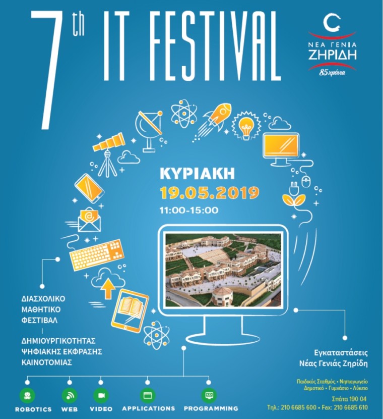 H Νέα Γενιά Ζηρίδη ανακοίνωσε το 7ο Διασχολικό Φεστιβάλ Τεχνολογίας (7th IT Festival), που θα πραγματοποιηθεί στις εγκαταστάσεις της την Κυριακή 19 Μαΐου 2019.