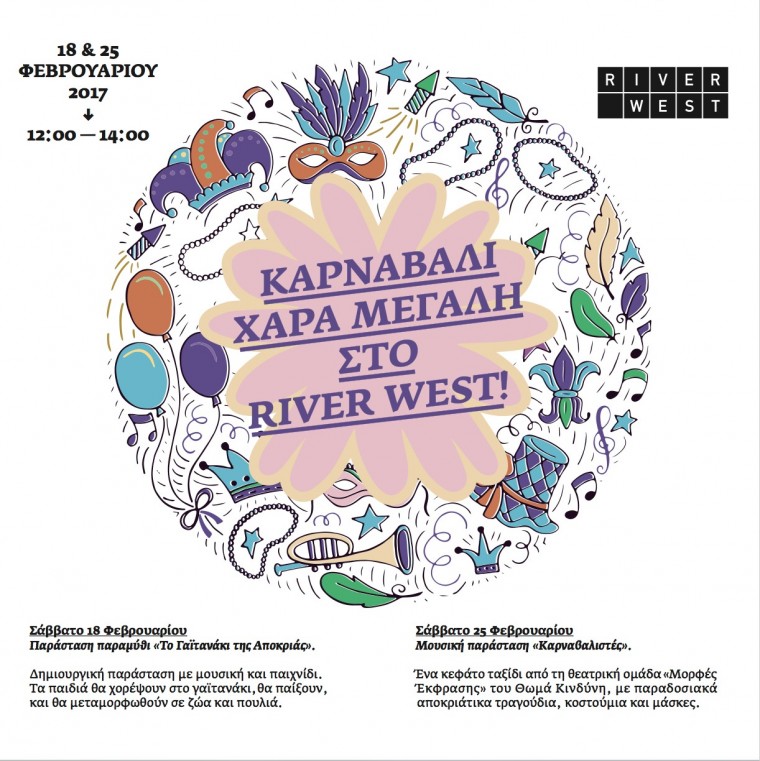 Τα έθιμα του μασκαρέματος, του χορού και του τραγουδιού έρχονται και φέτος στο River West με παραστάσεις, παραμύθια, παιχνίδια, μεταμφιέσεις, αλλά και παραδοσιακά τραγούδια και χορούς, το Σάββατο 18 & 25 Φεβρουαρίου!