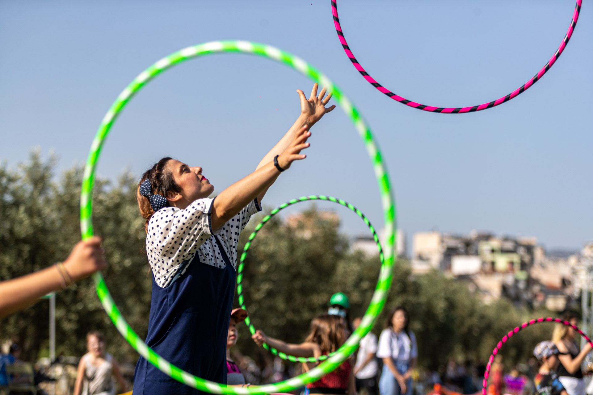 Όλοι μαζί συναντιόμαστε σε ένα διασκεδαστικό μουσικοκινητικό παιχνίδι: μαθαίνουμε απλά και σύνθετα κόλπα με hula hoop, χορεύουμε και εκφραζόμαστε δημιουργικά!