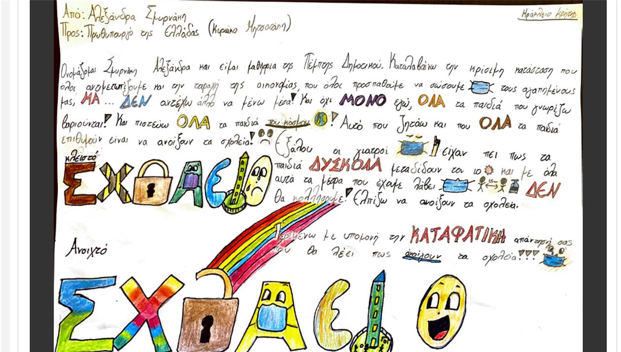 Η μικρή Αλεξάνδρα, μαθήτρια της Ε Δημοτικού σε σχολείο του Ηρακλείου, πήρε την πρωτοβουλία να στείλει γράμμα στον πρωθυπουργό, ζητώντας του ν ‘ανοίξει τα σχολεία, γιατί δεν αντέχει άλλο να είναι μέσα στο σπίτι.