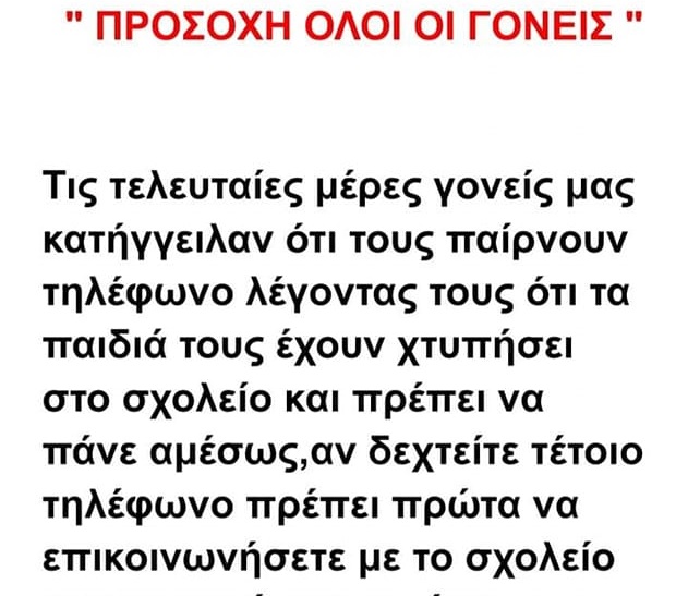Ένα αντίστοιχο περιστατικό δημοσιοποιήθηκε από τη σελίδα του 3ου Δημοτικού Σχολείου Ευκαρπίας γεγονός που μας προβλημάτισε και για ακόμη μια φορά φέρνει στο προσκήνιο τη σημασία του να είμαστε ιδιαιτέρως προσεκτικοί στα τηλεφωνήματα που λαμβάνουμε. Όταν σας καλέσουν άγνωστοι και σας ενημερώσουν για “τραυματισμό” του παιδιού στο σχολείο πριν πανικοβληθείτε, τηλεφωνήστε στο σχολείο για να επαληθεύσετε όσα σας είπαν και σε δεύτερο χρόνο καλό θα είναι να ενημερώσετε και την Αστυνομία καλώντας το «100».