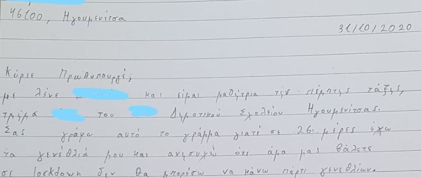 Λίγο πριν η χώρα μπει στο δεύτερο lockdown, μία 10χρονη από την Ηγουμενίτσα αποφάσισε να γράψει ένα γράμμα στον πρωθυπουργό, στο οποίο του εκφράζει την αγωνία της για τα επικείμενα γενέθλιά της, τα οποία δεν θα γιορτάσει συντροφιά με τους αγαπημένους της φίλους.