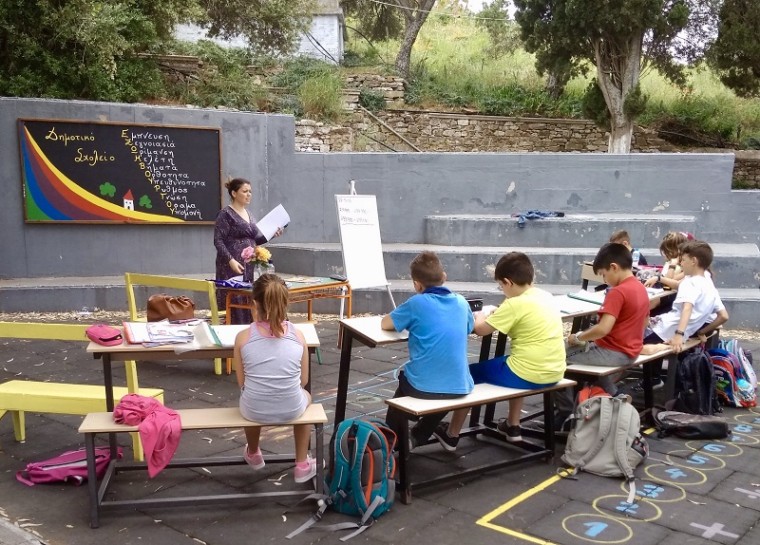 Τα θρανία στήθηκαν στην αυλή, ένας σχολικός πίνακας τοποθετήθηκε στο κέντρο, οι μαθητές χαρούμενοι πήραν θέση και το μάθημα ξεκίνησε!