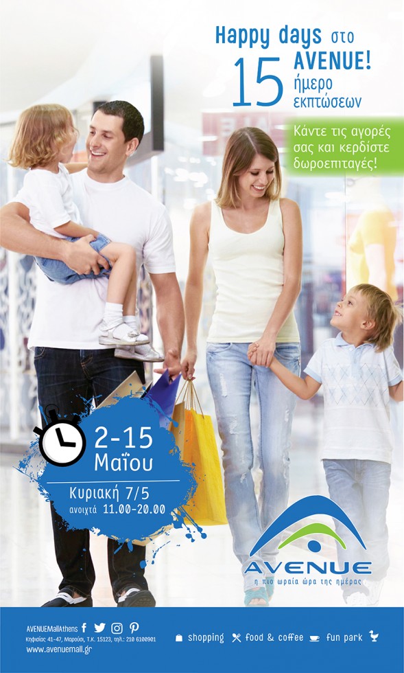 Έως τις 15 Μαΐου κάνετε τις αγορές σας με απίθανες ανοιξιάτικες εκπτώσεις σε όλα τα καταστήματα και την Κυριακή 7 Μαΐου απολαύστε τις αγορές σας από τις 11:00 το πρωί μέχρι τις 8:00 το βράδυ στον πιο ευχάριστο προορισμό! Και επειδή στο ΑVENUE οι μέρες είναι “Happy Days”, με αγορές αξίας 30€ και άνω μπαίνετε στην κλήρωση για να κερδίσετε δωροεπιταγές για να ψωνίσετε από τα καταστήματα του εμπορικού κέντρου και μετά τις εκπτώσεις.