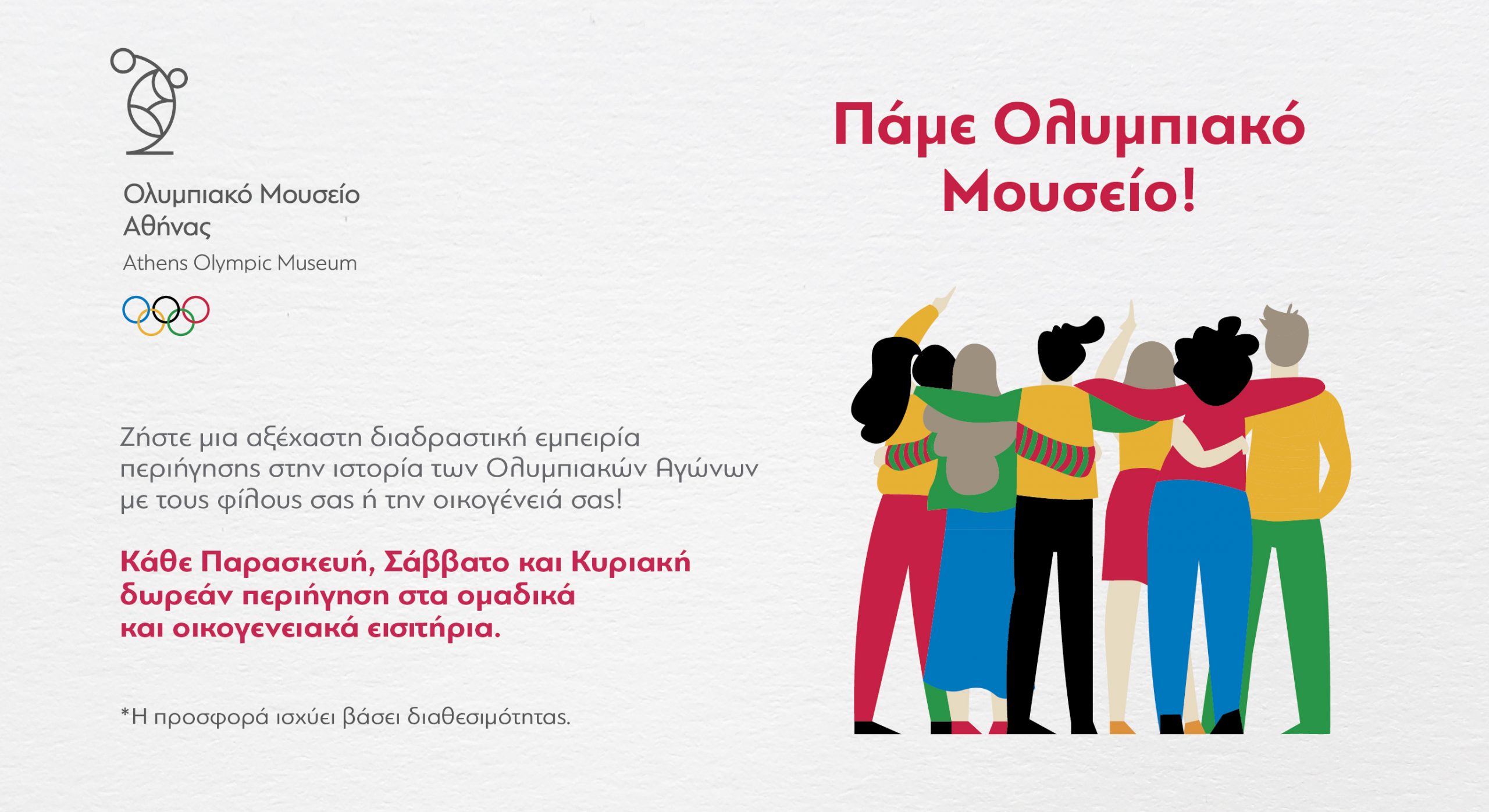 Ο Σεπτέμβριος είναι ιδανικός μήνας για να συνδυάσετε διασκέδαση και γνώση στο Ολυμπιακό Μουσείο Αθήνας. Επισκεφτείτε μαζί με την οικογένεια ή και τους φίλους το Μουσείο και ζήστε μία αξέχαστη εμπειρία και δημιουργικό χρόνο μαζί με τους αγαπημένους σας. Με την αγορά ενός ομαδικού εισιτηρίου (άνω των 5 ατόμων) ή ενός οικογενειακού εισιτηρίου, από Παρασκευή έως και Κυριακή, όλοι απολαμβάνουν με την επίσκεψη τους, μία μοναδική δωρεάν περιήγηση στους χώρους της μόνιμης έκθεσης.