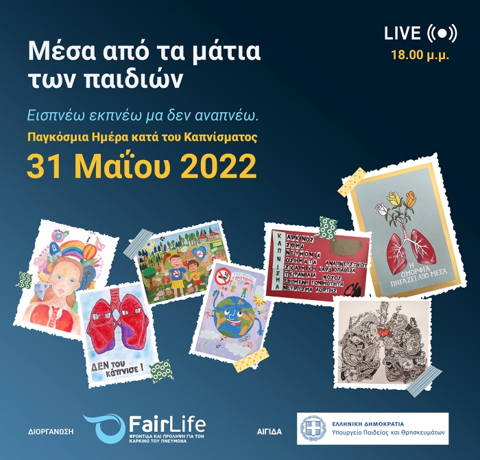 Με αφορμή την «Παγκόσμια Ημέρα κατά του Καπνίσματος» η FairLifeL.C.C.- Φροντίδα και Πρόληψη για τον καρκίνο του πνεύμονα πραγματοποίησε διαδικτυακή εκδήλωση όπου παρουσιάστηκε η νέα νεανική αντικαπνιστική εκστρατεία με βασικό μήνυμα «Εισπνέω, εκπνέω μα δεν αναπνέω. Η επιλογή είναι μέσα σου».