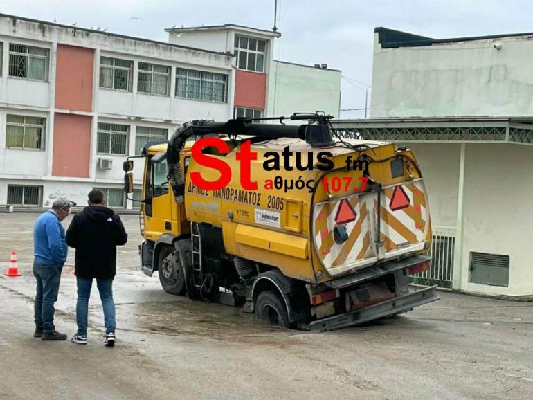Απίστευτο περιστατικό σε σχολείο στην Πυλαία: Φορτηγό του δήμου έπεσε μέσα σε μεγάλη τρύπα που άνοιξε στην αυλή
