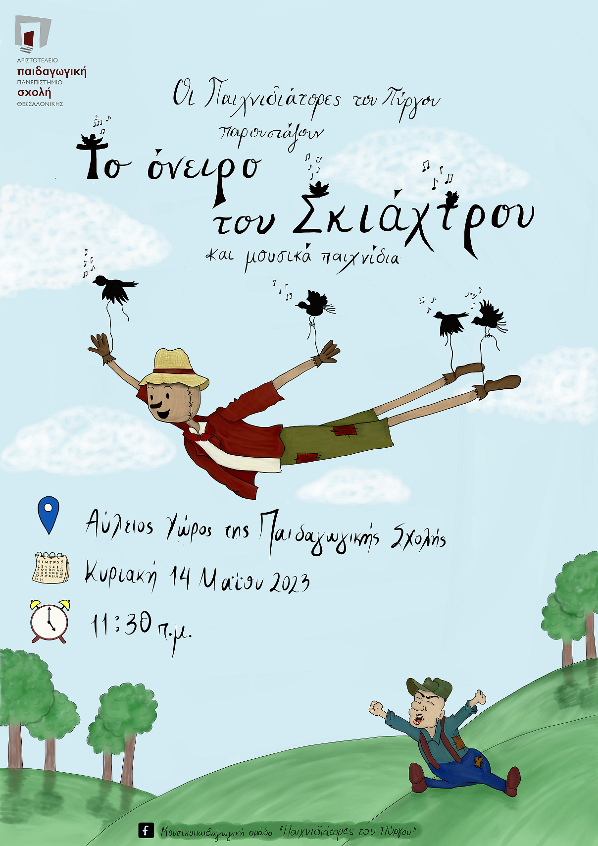 Η Μουσικοπαιδαγωγική Ομάδα «Παιχνιδιάτορες του Πύργου» της Παιδαγωγικής Σχολής του ΑΠΘ παρουσιάζει την παράσταση «Το όνειρο του σκιάχτρου και μουσικά παιχνίδια», την Κυριακή 14 Μαΐου και ώρα 11.30, στον αύλειο χώρο της Παιδαγωγικής Σχολής του ΑΠΘ.
